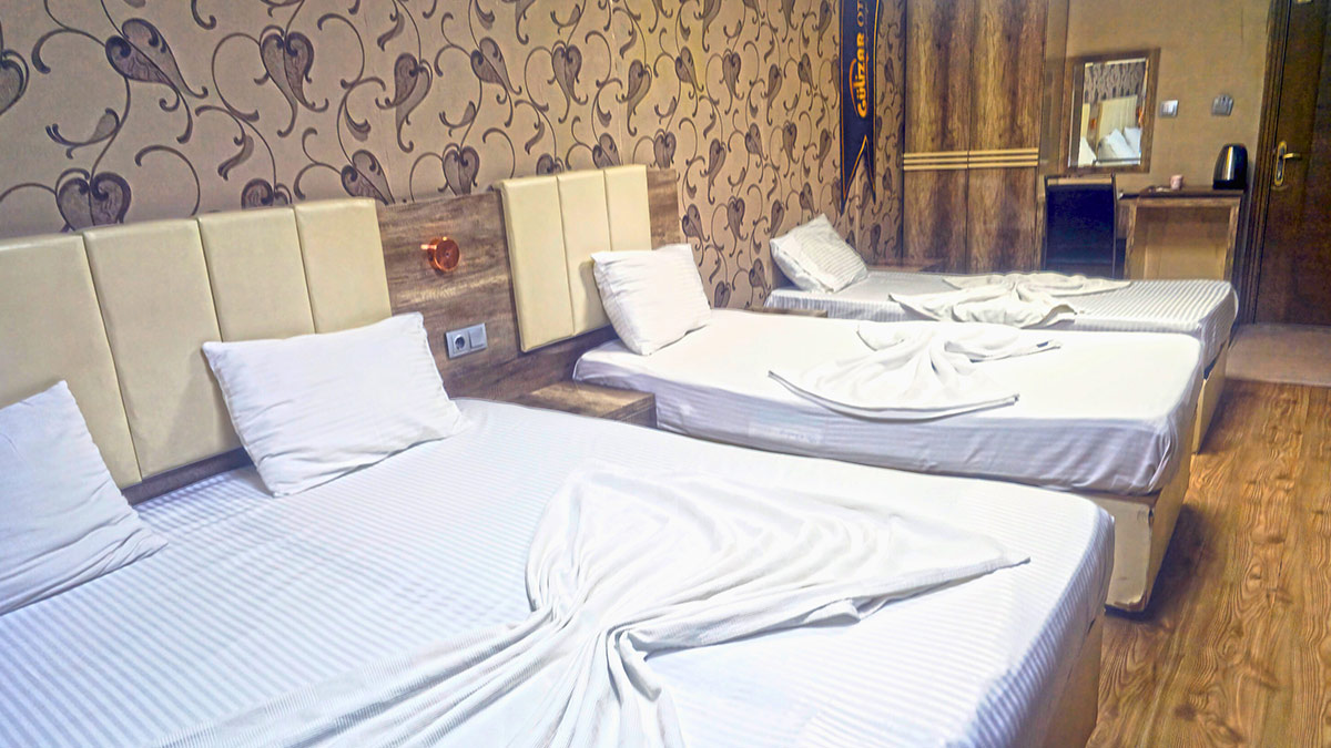 Geniş ve aydınlık iç mekânı ile konuklarına ferah bir atmosfer sağlayan triple odamız, hem kısa süreli hem de uzun süreli konaklamalar için idealdir. Gülizar Butik Hotel’in huzurlu ortamında, sevdiklerinizle birlikte konforlu ve keyifli bir konaklama deneyimi yaşayın.